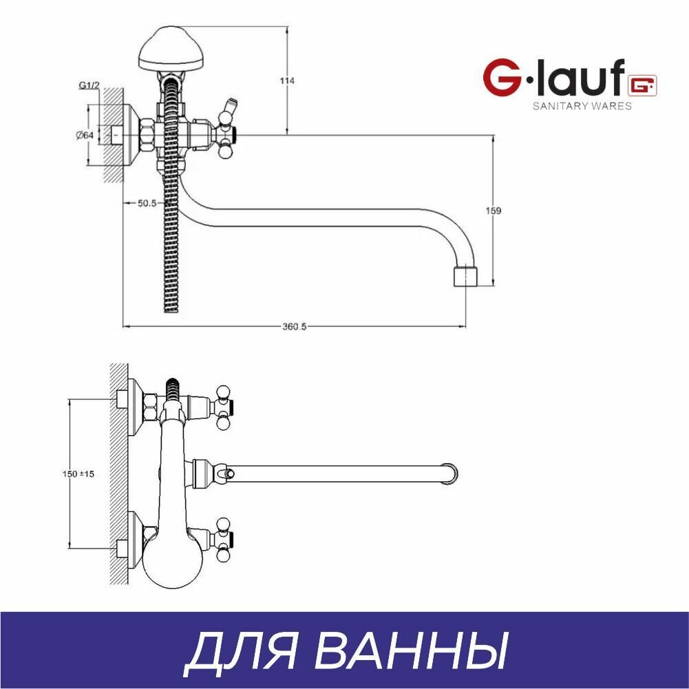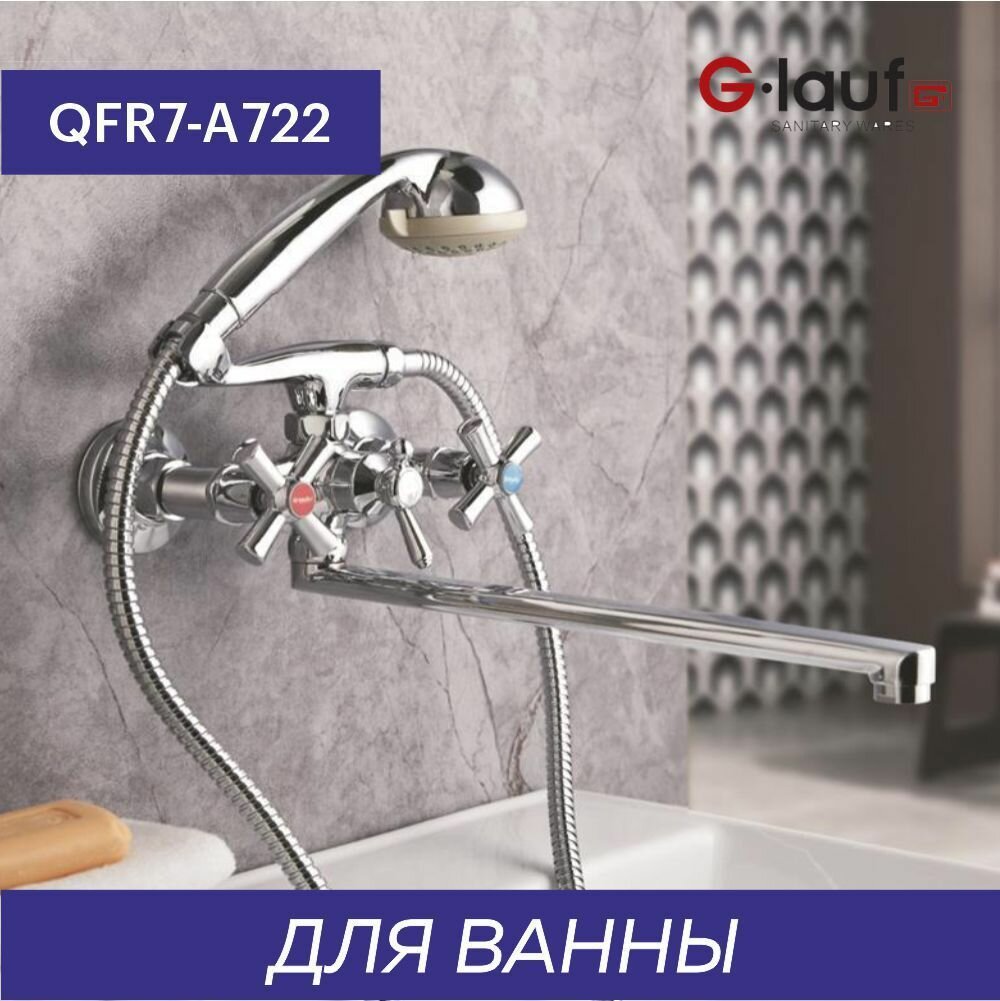 Смеситель для ванны с душем двухвентильный, кран в ванную G.lauf QFR7-A722, хром