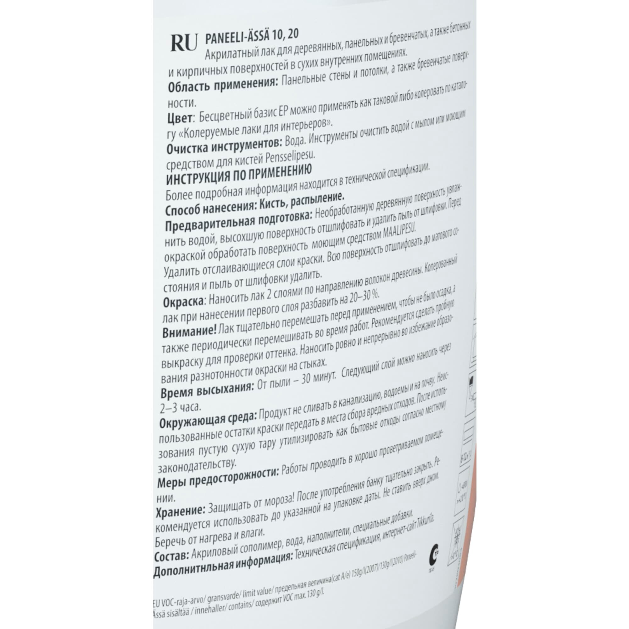 Лак акрилатный полуматовый Paneeli-Ässä 20 (Панели-Ясся 20) TIKKURILA 2,7 л бесцветный (база EP)