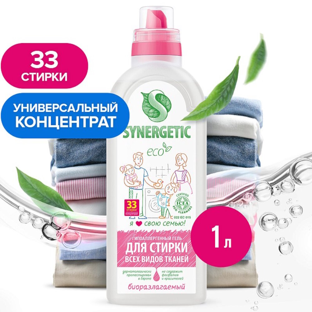 Гель для стирки Synergetic, универсальный, гиппоаллергенный, биоразлагаемый, 1л