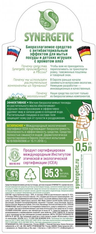 SYNERGETIC Средство для мытья посуды, детских игрушек биоразлагаемое SYNERGETIC с ароматом алоэ, 0,5 л