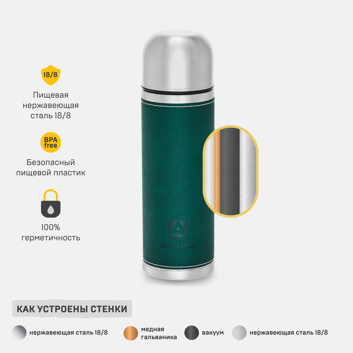 108-500-Зеленая- Кожа Термос Арктика бытовой, вакуумный, питьевой, 500 мл,