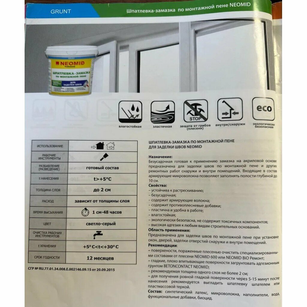 Шпатлевка-Замазка Neomid 5кг Безусадочная для Заделки Швов по Монтажной Пене.