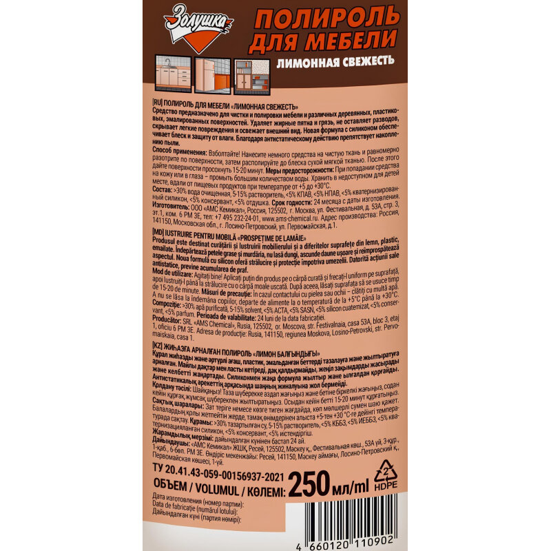 Полироль для мебели Лимонная свежесть золушка 250мл , шт