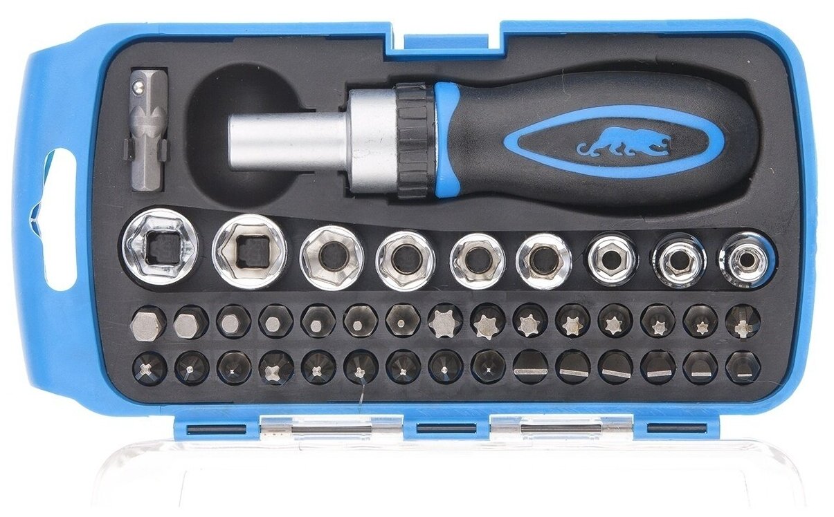 Много разных бит. Удобная ручка. Недостатки: Очень короткая. Пришлось докупать удлиняющий адаптер. |