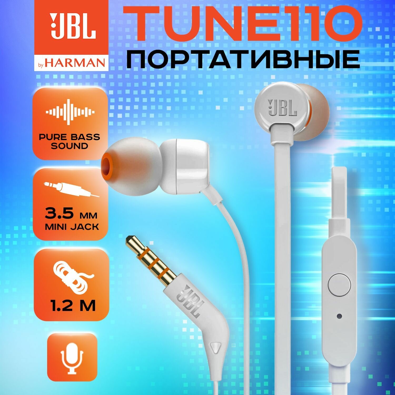Наушники JBL Tune 110, 3.5 мм, внутриканальные, белый [jblt110wht]