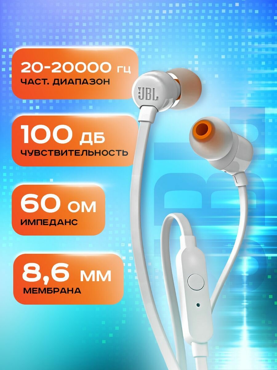 Наушники внутриканальные JBL T110 с микрофоном, 3.5мм, белый (JBLT110WHT)