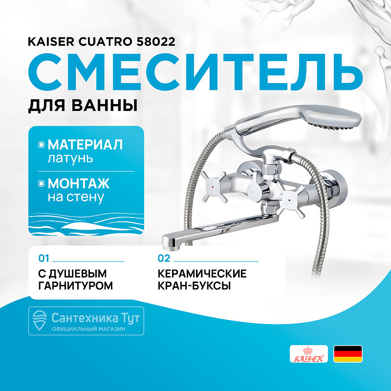 Ниже Вы можете прочитать отзывы на Смеситель для ванны двухвентильный Kaiser Cuatro 58022, с душем, ознакомится с подробными характеристиками, посмотреть интересные обзоры и фотографии на Смеситель для ванны двухвентильный Kaiser Cuatro 58022, с душем.