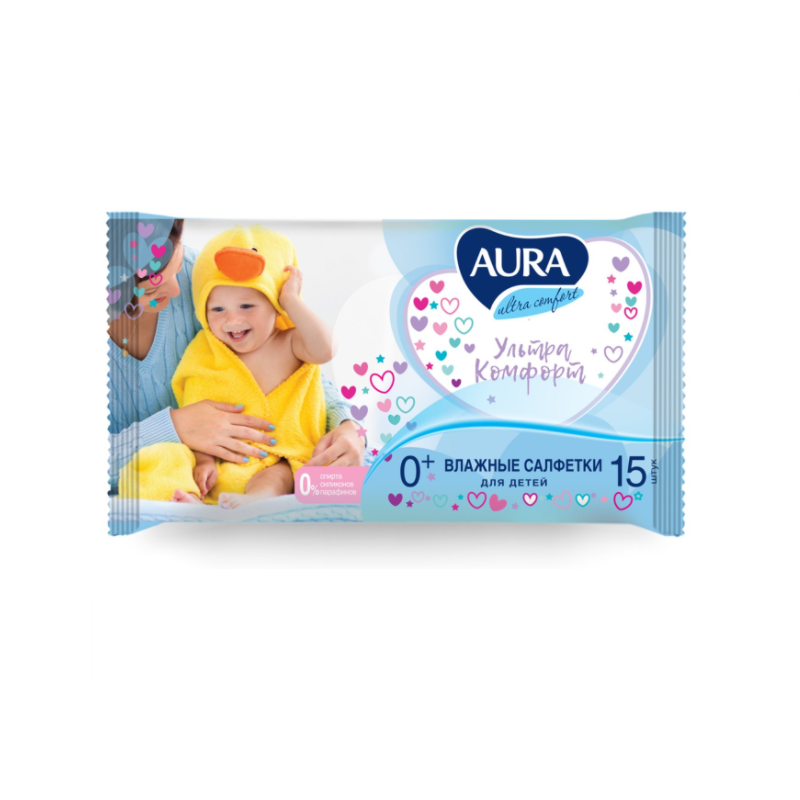 Салфетки влажные Aura "Ultra comfort", 15шт., детские, универсал. очищающие, без спирта
