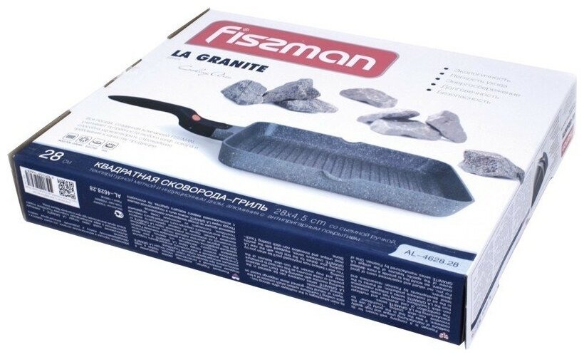 4628 FISSMAN Сковорода-гриль LA GRANITE 28x4,5см Квадратная со съемной ручкой и температурной меткой (алюминий с антипригарным покрытием TouchStone) Ручка-бакелит; Индукция