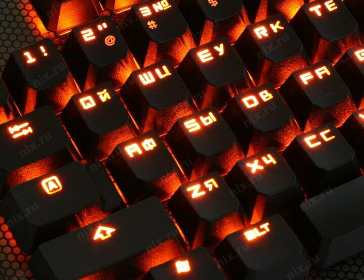 Стык глянцевой прозрачной пластиковой накладки на поверхности клавы, под которой рисунок шестиугольной сетки и чёрного пластика корпуса будет забиваться грязью, которую придётся чистить с чем-то острым. Подсветка устроена так, что лампочки расположены чуть выше клавиш и светят под углом мимо клавиш. Это натурально ночник, который ночью освещает потолок оранжевой засветкой. Зато нижняя часть клавиш остаётся без подсветки, например на кнопках около энтера и правого шифта: точки, запятые, слеш - они банально почти не подсвечиваются. Также как и нанесённые в нижней части клавишь спец. символы на цифрах подсвечены плохо. Не проблема, но портит вид клавиатуры. |
