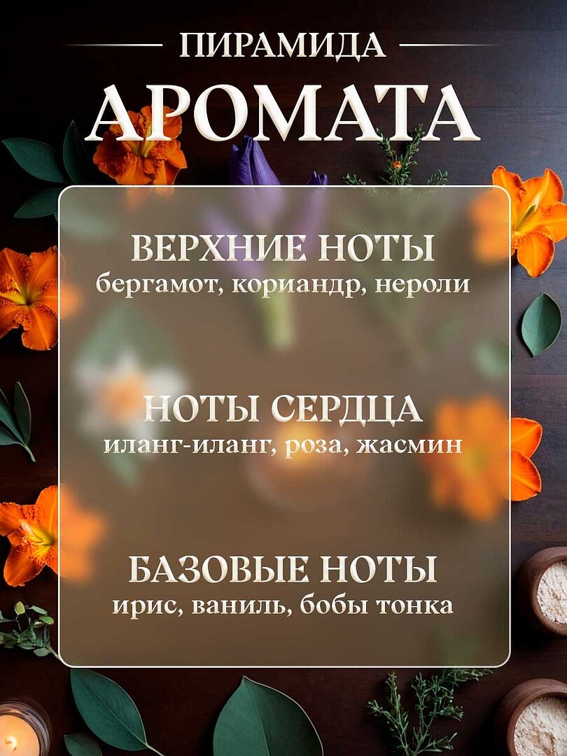 Приятный аромат. Сначала вас встретят нотки бергамота и нейроли. В сердце аромата иланг-иланг, роза и жасмин, а в шлейфе аромата чётко чувствуются ирис, ваниль и бобы тонка. Я купил этот аромат из интереса и неожидал, что он мне так сильно понравится) |