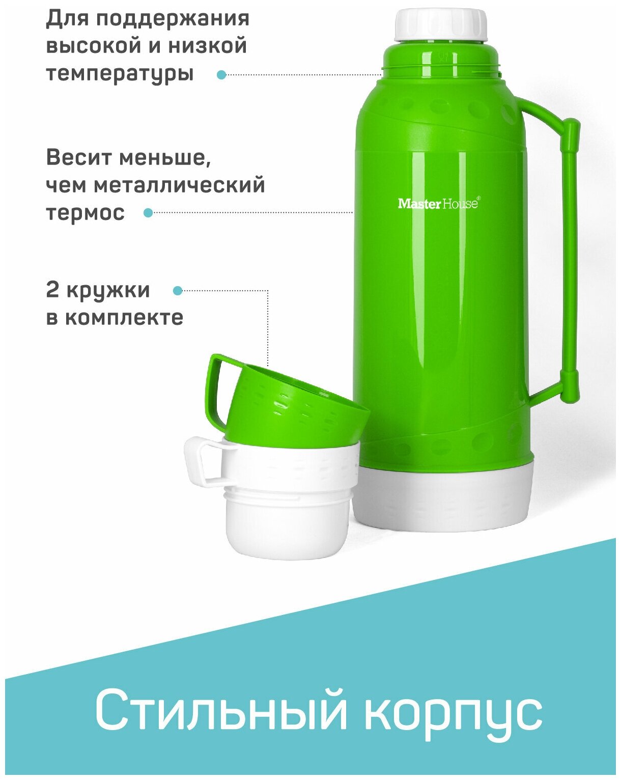 Термос Венеция стекл. колба/пластик узкое горло, 2л, чашки 2шт, зеленый, арт.60271 Master House (арт. 582657)