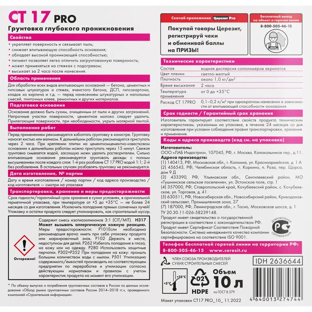 СохранитьГрунтовка CERESIT (10 л, СТ 17 PRO, (4744)) интересное: