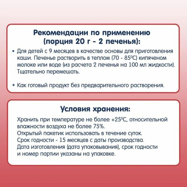 Неплохой состав печенья, но едим без энтузиазма. Подмешиваю в пюре фруктовое. Недостатки: Слишком сладкое Hipp и semper печенье вкуснее |