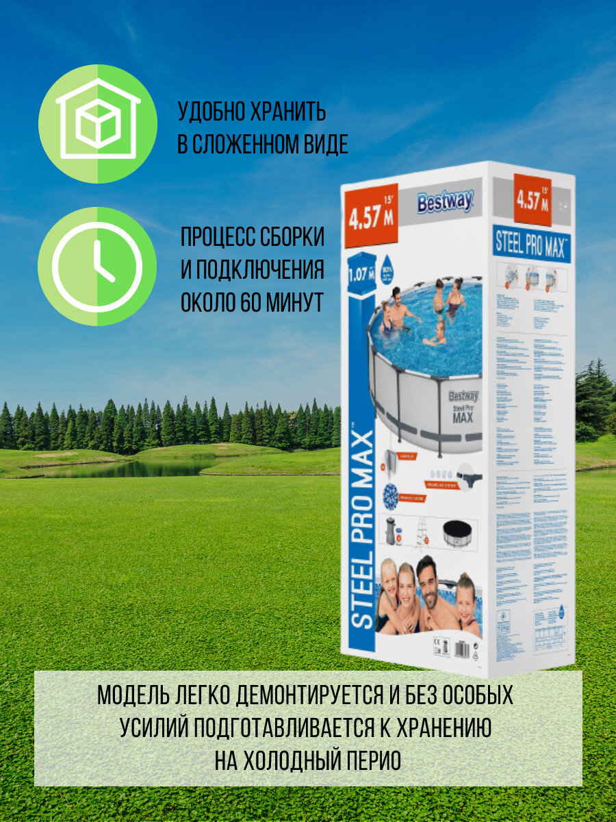 Бассейн каркасный круглый с фильтр-насосом Bestway 56488 Steel Pro Max 457х107 см 14970л / Бассейн бествей семейный для дачи с жестким бортом