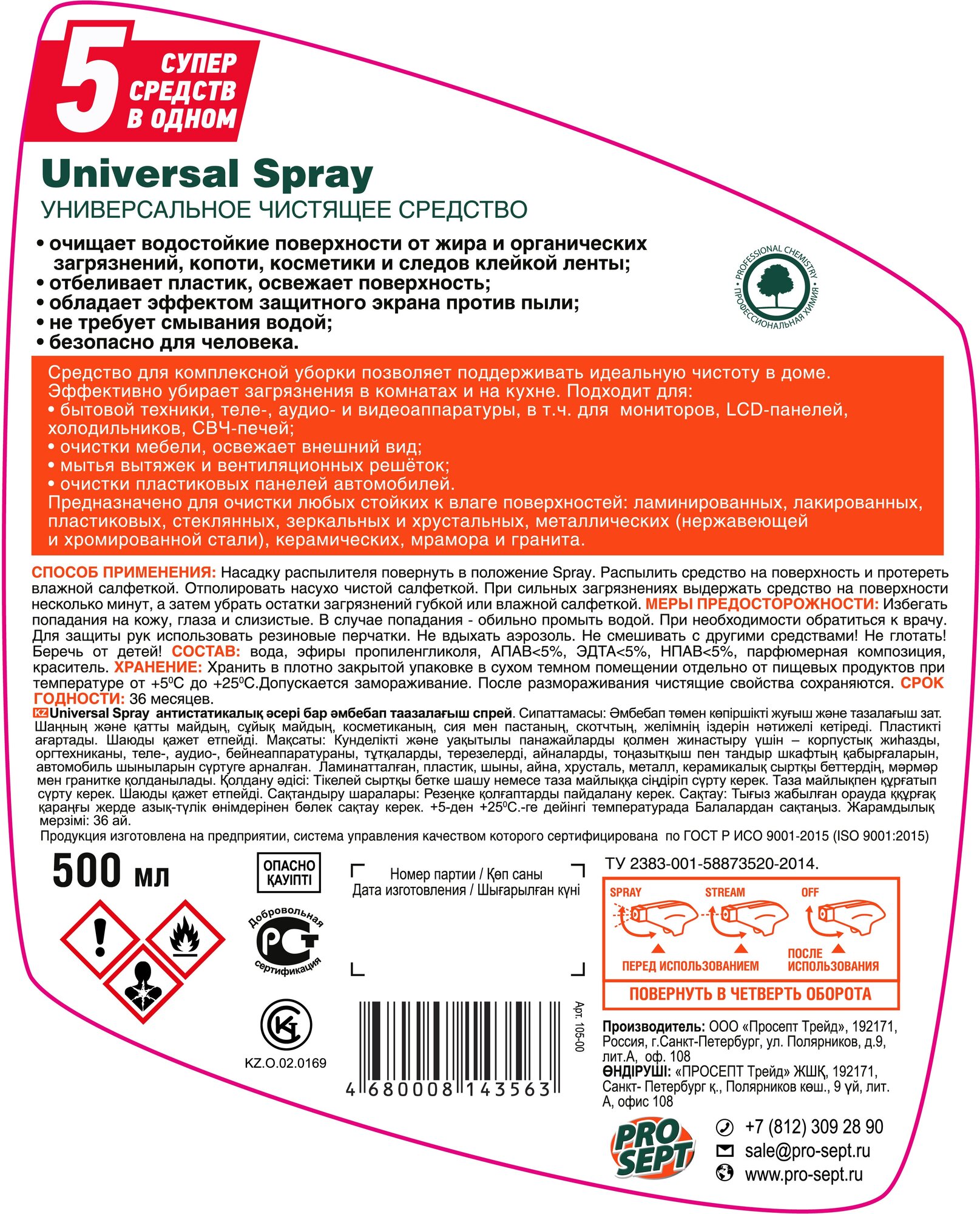 Универсальное моющее и чистящее средство Universal Spray, готовое к применению, 5 л PROSEPT 1284631 .