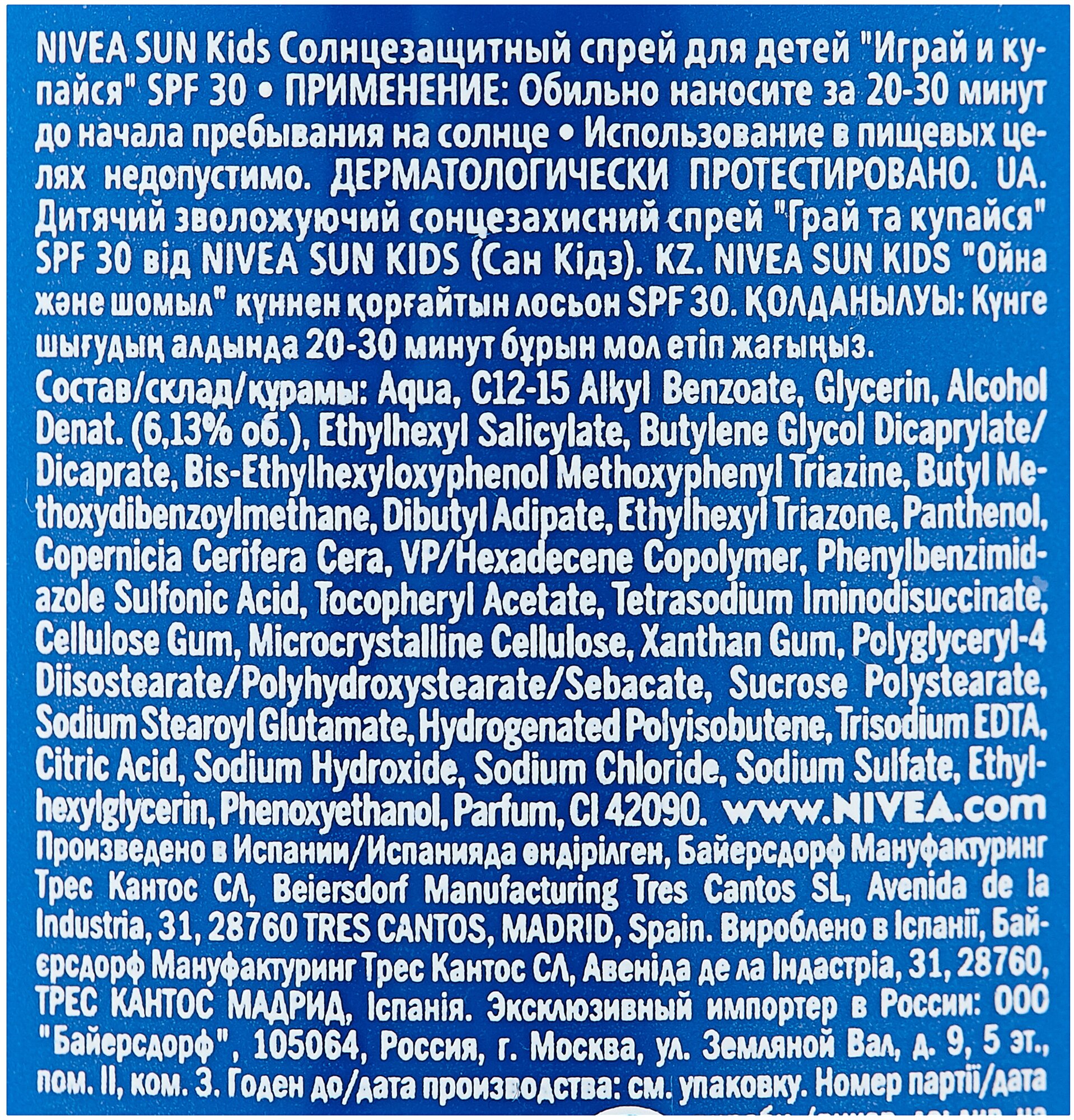 Спрей солнцезащитный детский NIVEA Sun Играй и купайся SPF30, 200мл