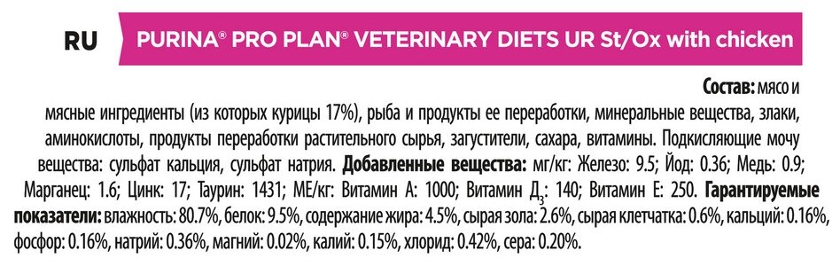 Влажный корм для кошек Purina Pro Plan Veterinary Diets UR St/Ox Urinary, при болезни нижних отделов мочевыводящих путей, с курицей, 85 г