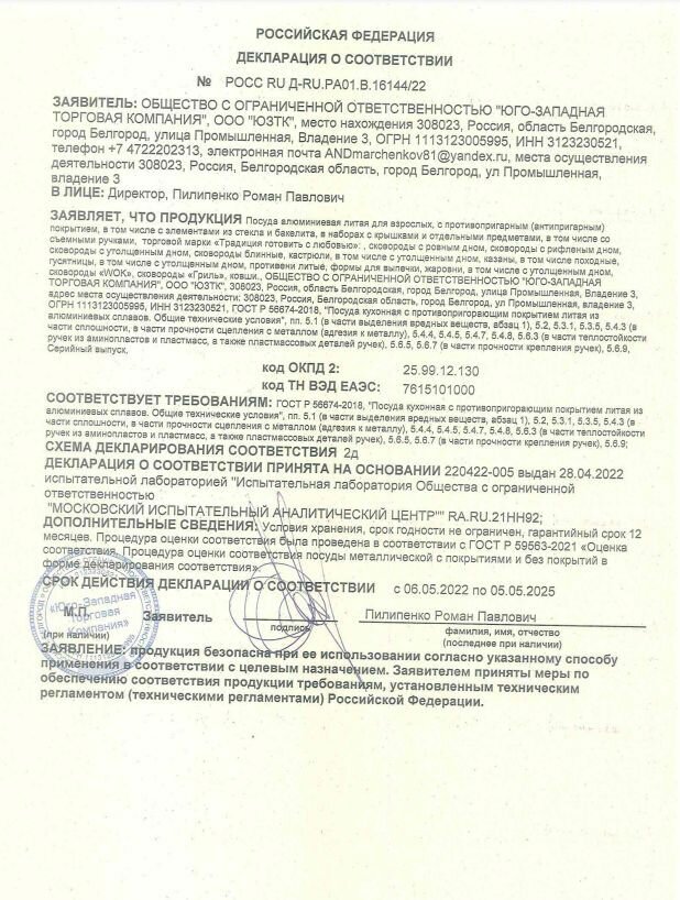 | Толщина дна | 6 мм |
