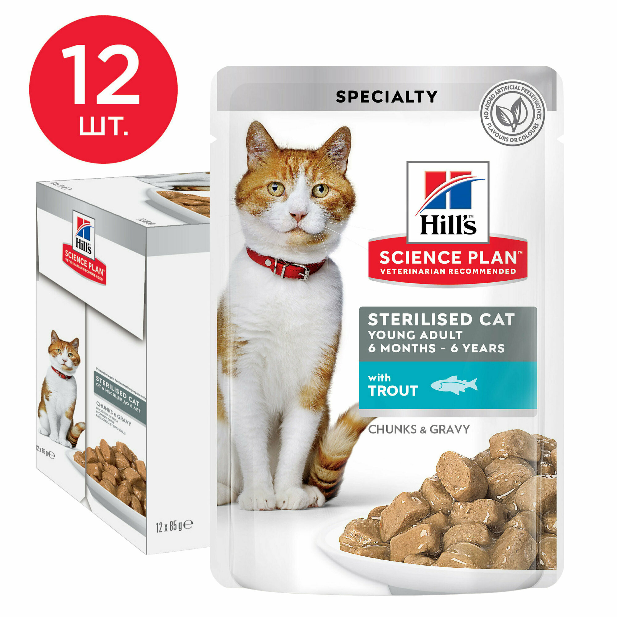 СохранитьКорм влажный HILLS Hill's Science Plan Sterilised Cat Young Adult with Trout для стерилизованных кошек до 6 лет, Форель 12шт.*85 г интересное:
