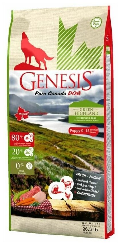 Генезис Зеленое Нагорье для щенков, юниоров, беременных и кормящих собак с курицей, козой и ягненком / Genesis Green Highland 11,79 кг