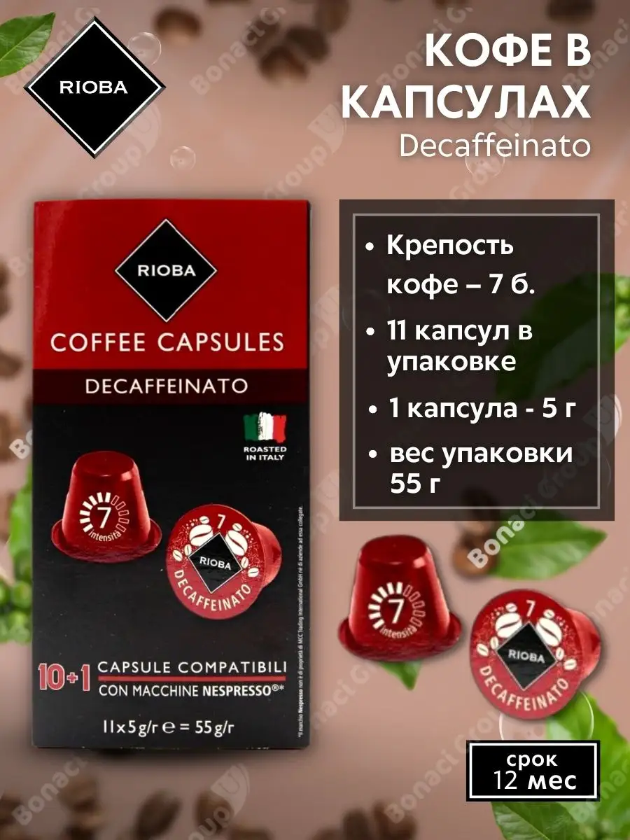 Кофе в капсулах RIOBA / Decaffeinato / Средняя обжарка / Капсулы для Nespresso / Кофе Риоба для Неспрессо / Italy / 11шт