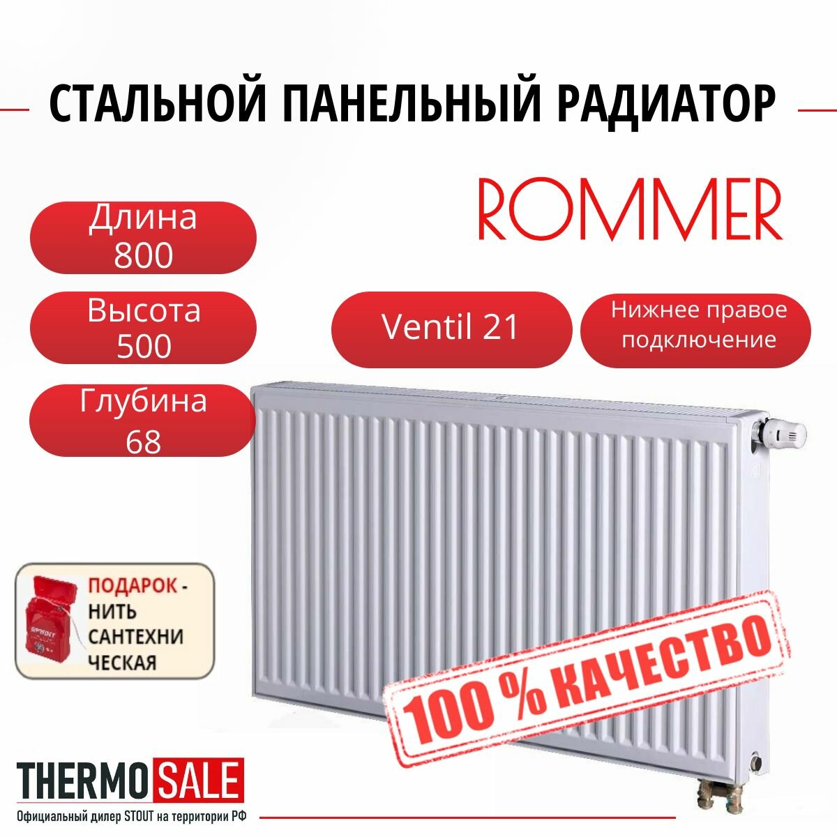 Радиатор стальной панельный ROMMER 500х600 нижнее правое подключение Ventil 21/500/600 Нить сантехническая