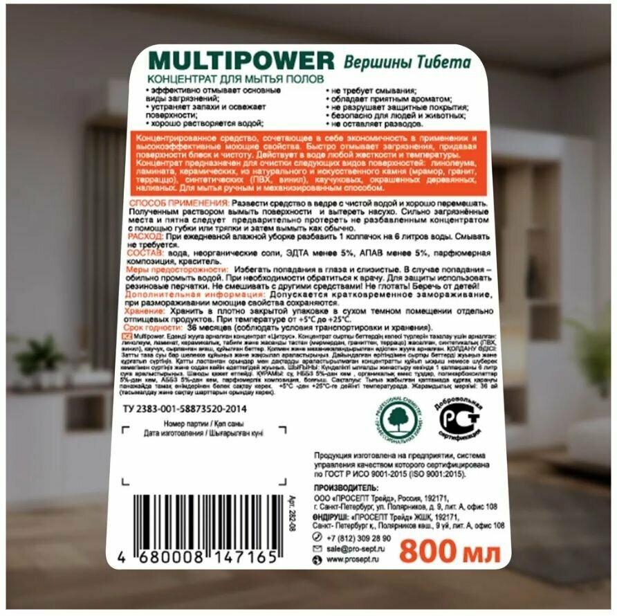 Средство для мытья полов "MULTIPOWER" (вершины тибета) концентрат 800 МЛ (1/12) "PROSEPT"