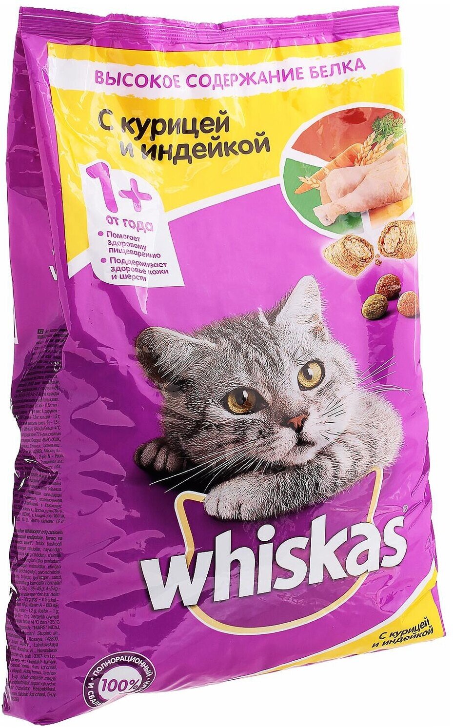Сухой корм Whiskas для кошек, курица/индейка, подушечки, 1,9 кг