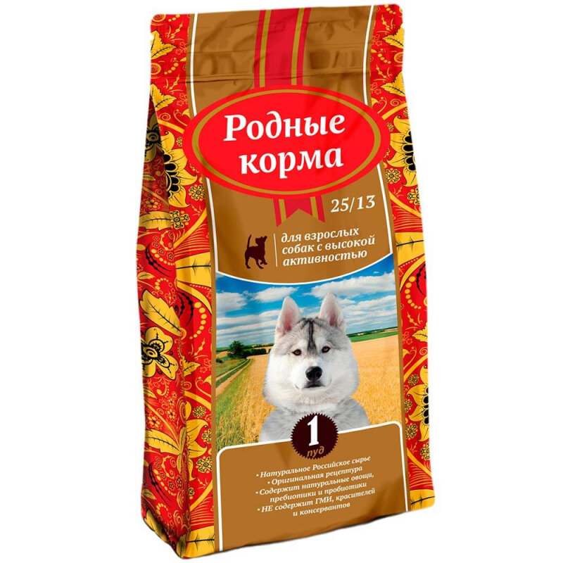 Родные корма 25/13 1 пуд 16,38 кг сухой корм для взрослых собак с высокой активностью