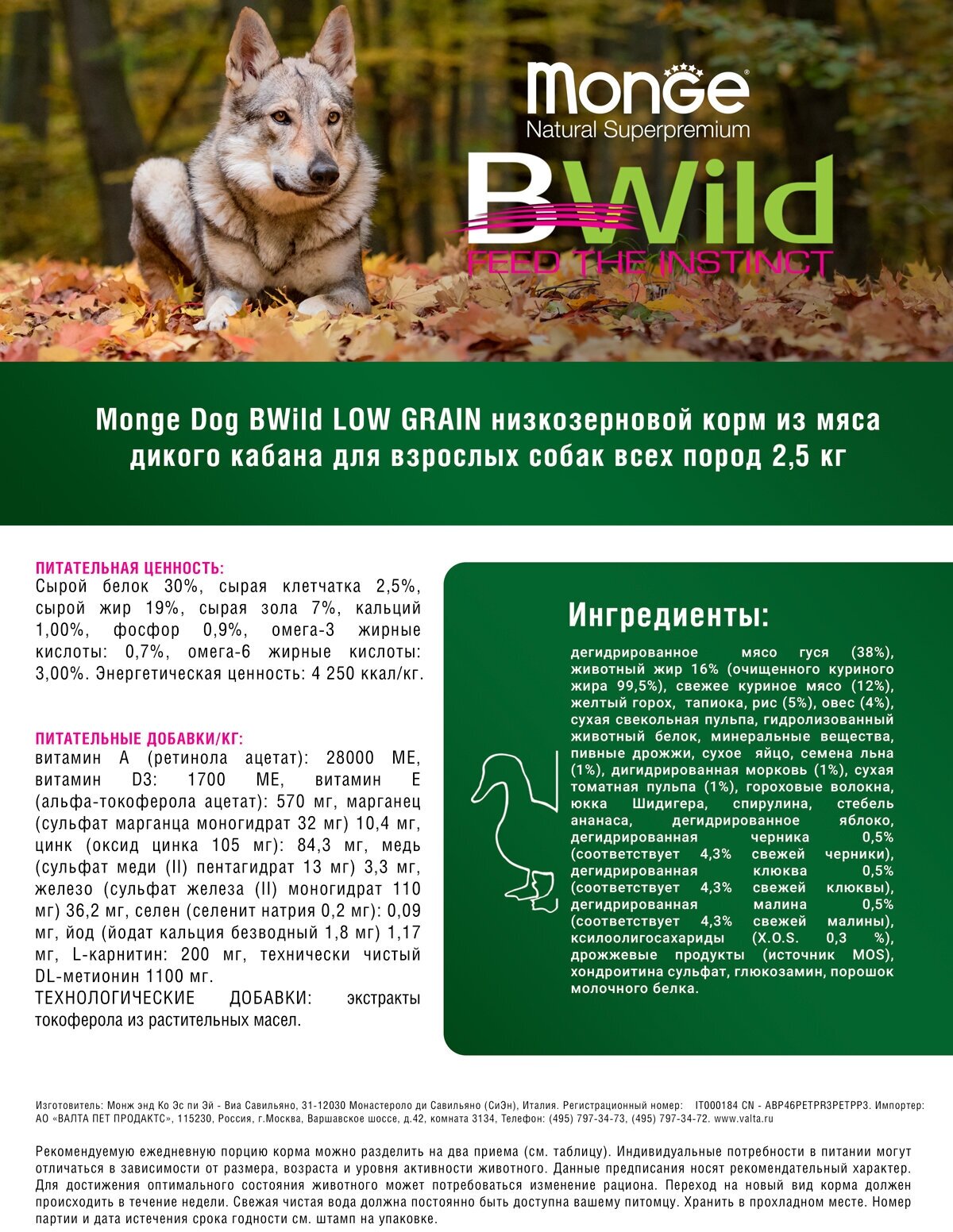 "Корм сухой Monge Dog BWild Low Grain, низкозерновой из мяса дикого кабана, для взрослых собак всех пород, 2,5 кг"
