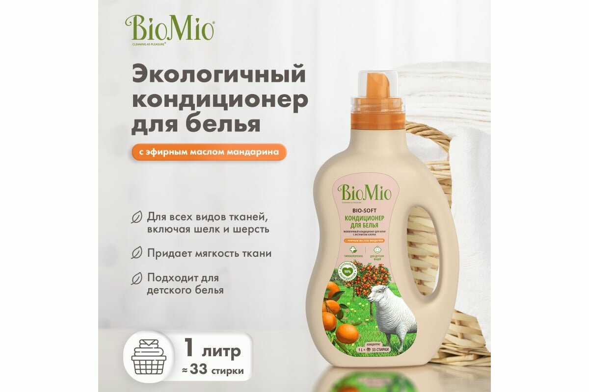 Кондиционер для белья BioMio BIO-SOFT с эфирным маслом мандарина, экологичный концентрат, 1 л