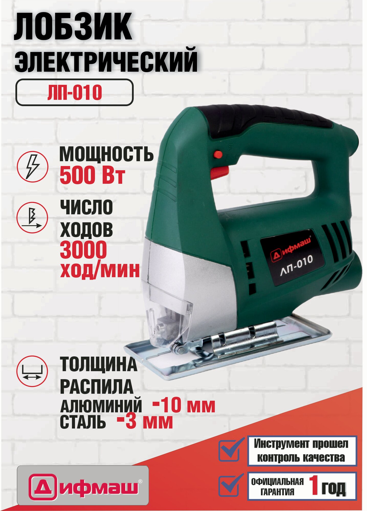 ЛП-010 "дифмаш", 500Вт.3000 ход./мин. глубина пропила в дер.55 мм.цвет.мет.10 мм.стали 3 мм. 1,3 кг