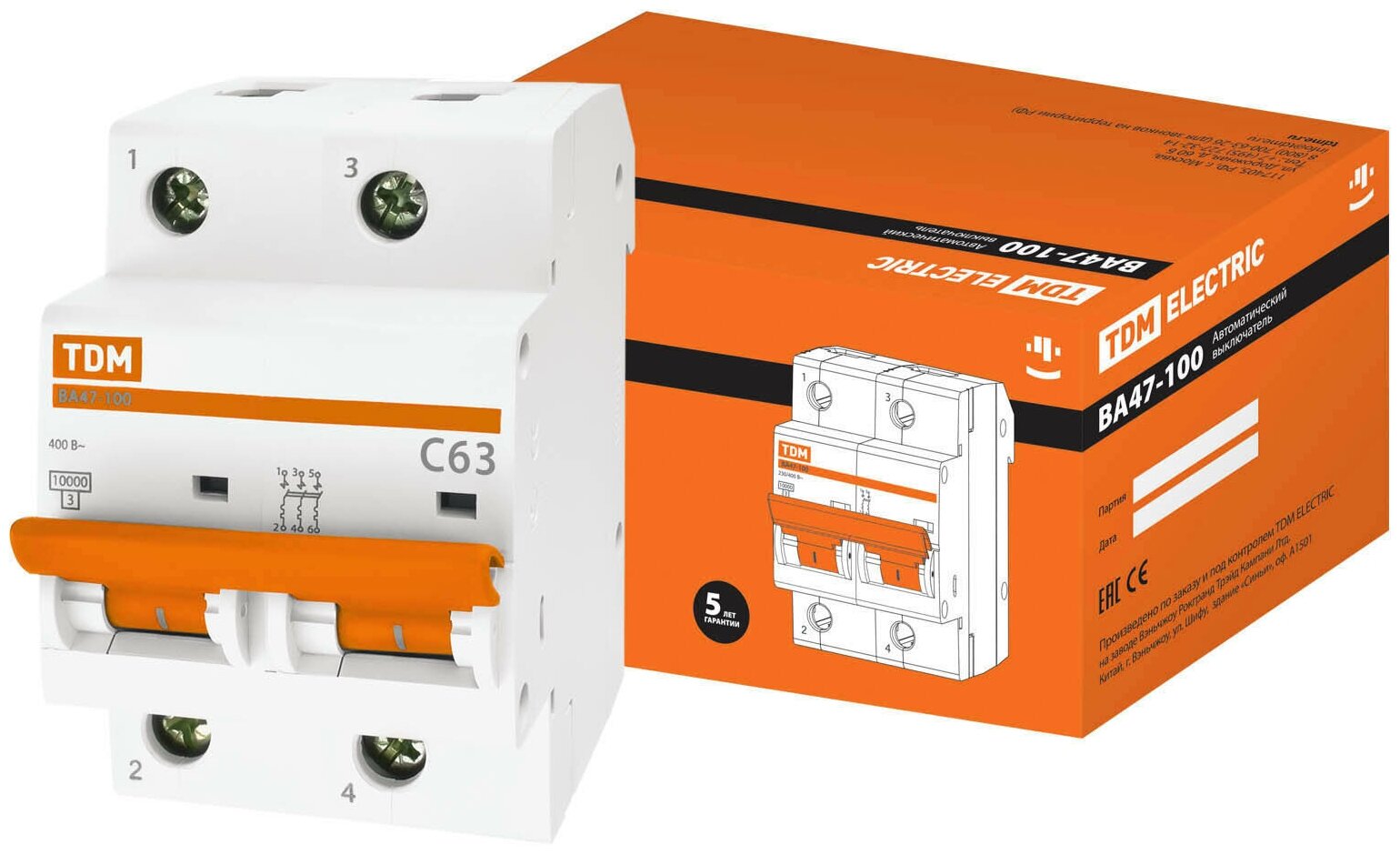 Авт. выкл. ВА47-100 2Р 63А 10кА х-ка С TDM сн/пр (в упаковке 1 шт.)