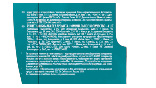 | Минусы: | Качество первых партий из Светогорска было очень хорошим (может быть, в Питер её до сих пор поставляют). Но после пуска завода в Советске под Тулой бумага оттуда стала соответствовать прежней трёхслойной. Старый фокус производителей (также было с кофе Нескафе и Пеле и со спиртом Ройял). |