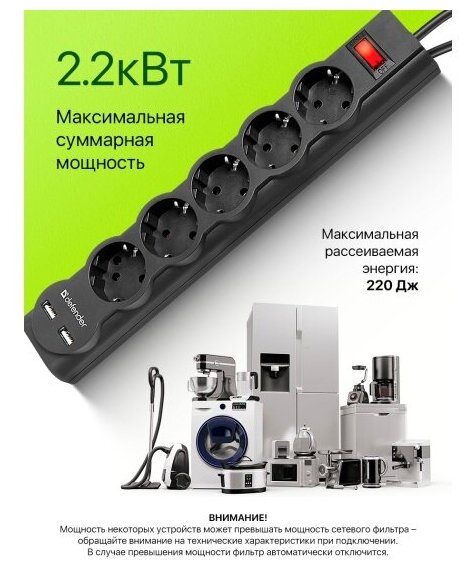Сетевой фильтр DEFENDER DFS755, 5 розеток, ПВС 3*1,0 мм2, мощность 2200 Вт, ток 10А, черный, 5,0 м 2xUSB, 2.1A