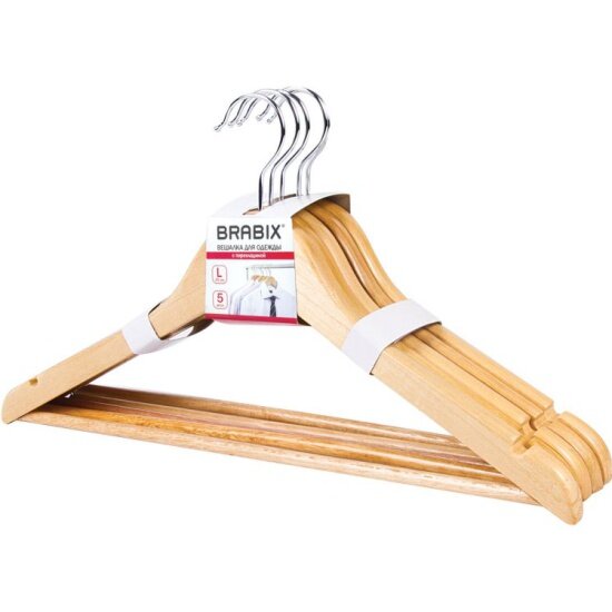 Вешалка-плечики деревянная Brabix "Стандарт", размер 45см, перекладина, натуральный цвет, 5шт. (601159)