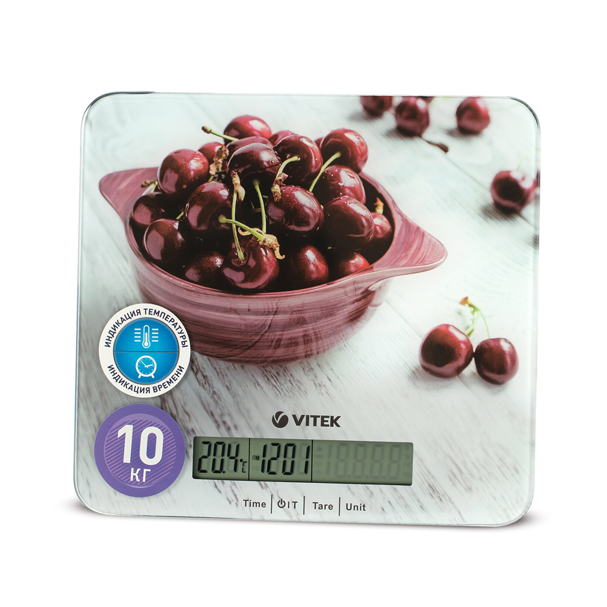 Весы Кухонные10кг ЖК Диспл Индик Заряд Бат,перегр,темп Часы 20Х18,3СМ Стекло Вишня Vitek .