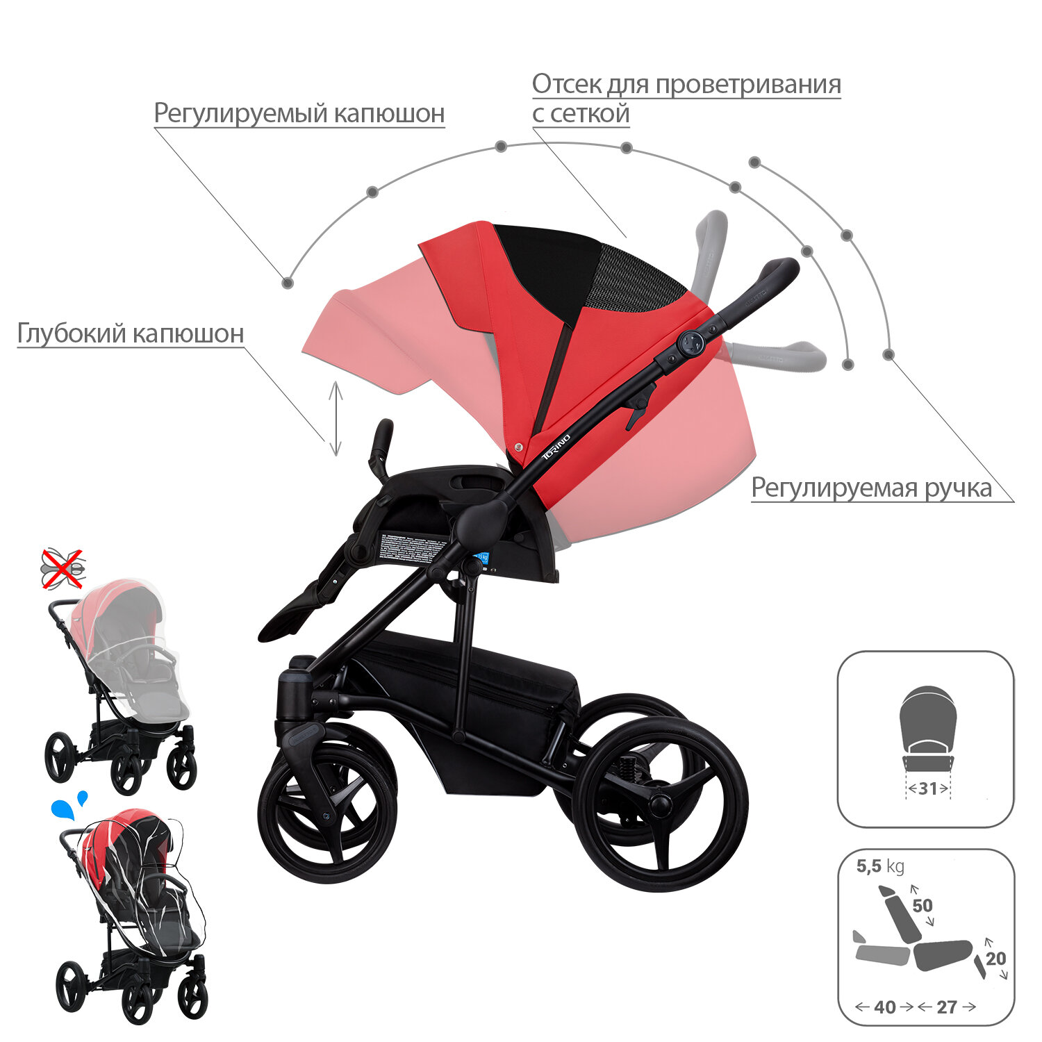 | Плюсы: | Стильная, современная, козырёк опускается у люльки до самого короба, сумка-рюкзак, легкая |