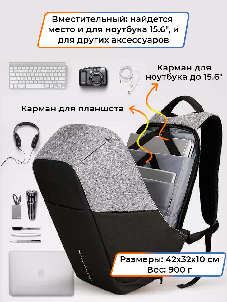 Рюкзак-антивор городской дорожный мужской Mark Ryden универсальный 13л, для ноутбука 15.6", влагостойкий, молодежный, с USB портом, черный/серый