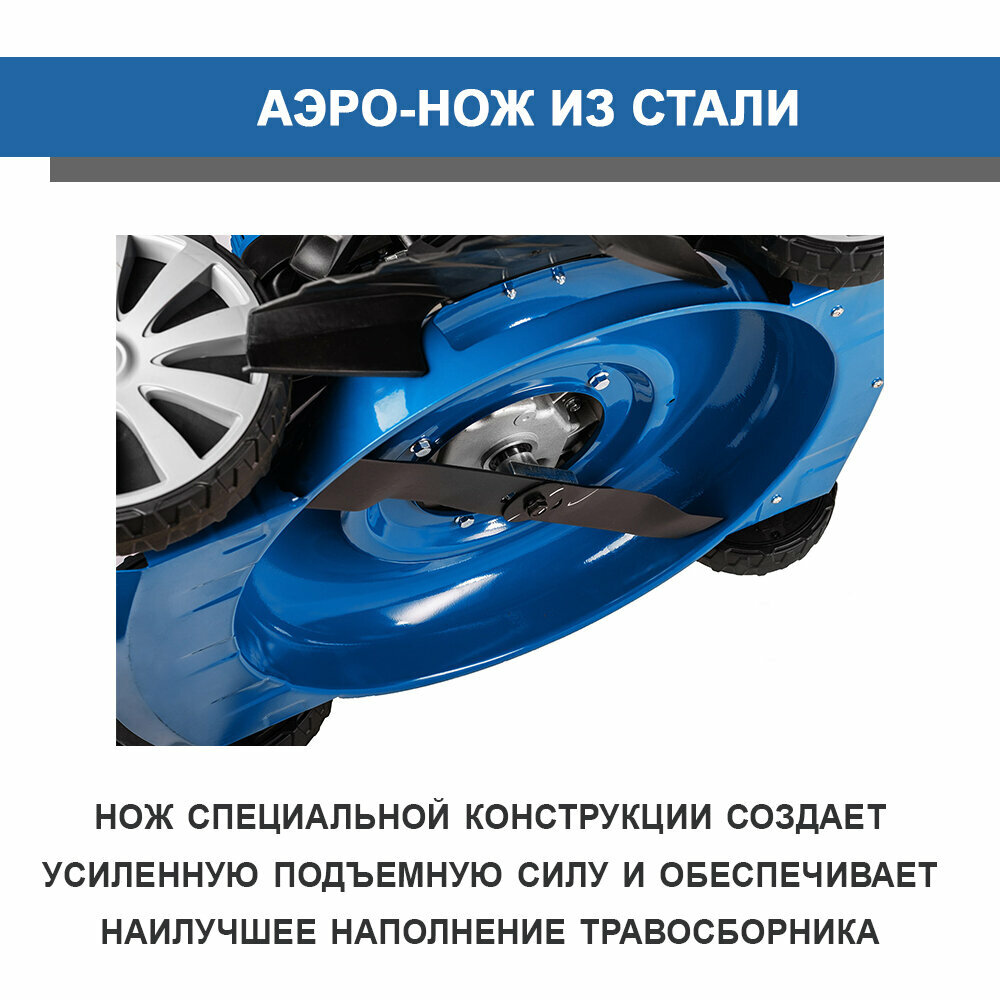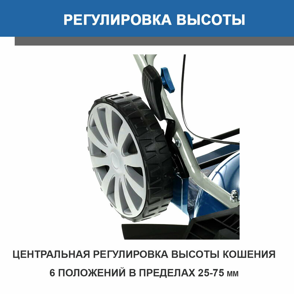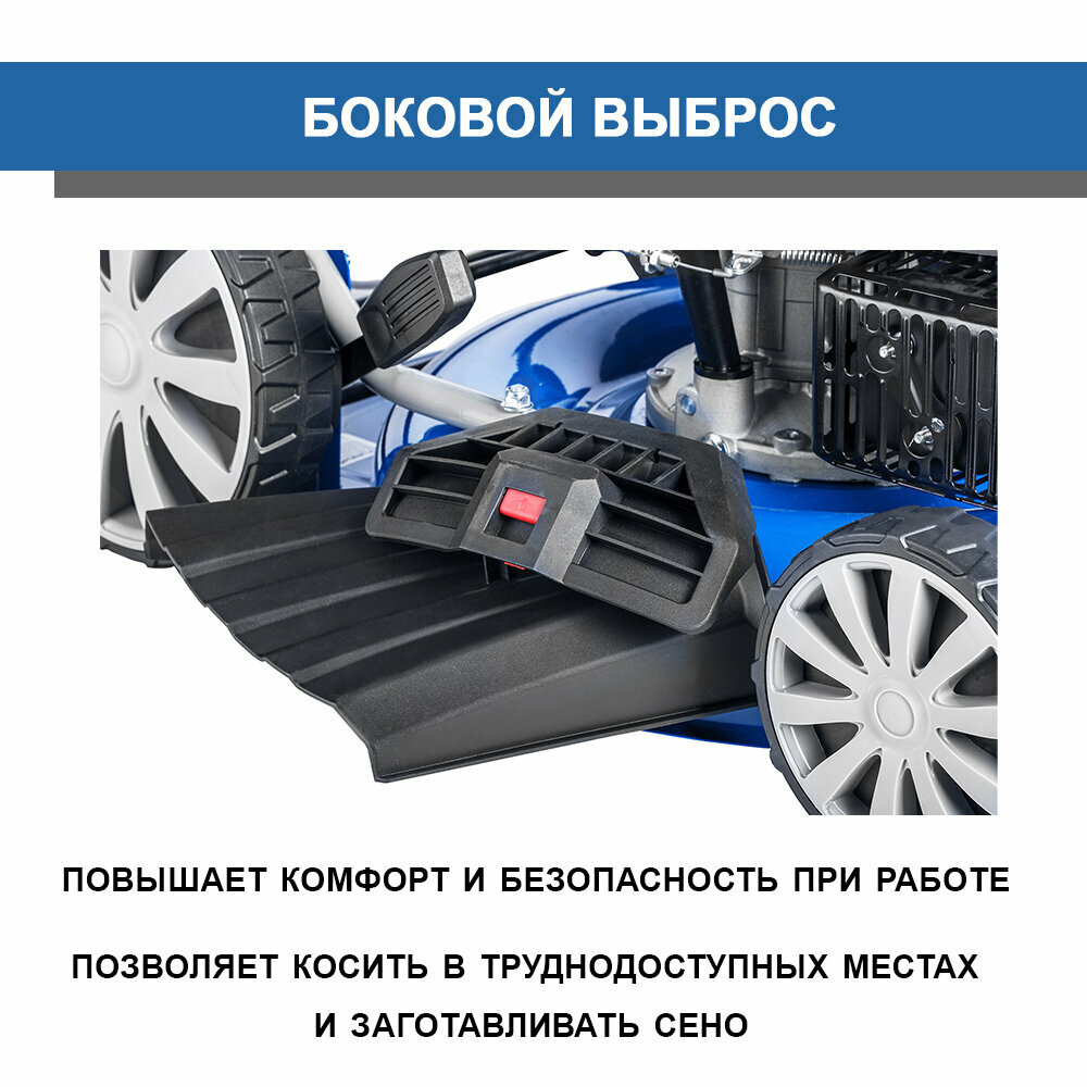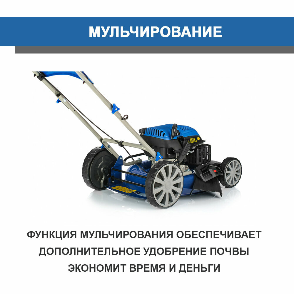 | Дополнительные функции | возможность установки мульчирующей насадки / регулировка высоты скашивания / тормоз двигателя |