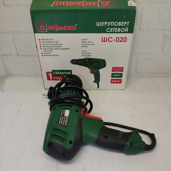 ШС-020 "дифмаш", 0,650 Вт,0-750 об/мин,БЗП 10 мм. Мах. шурупов 6 мм. 24 Н*м. вес 1.1 кг.