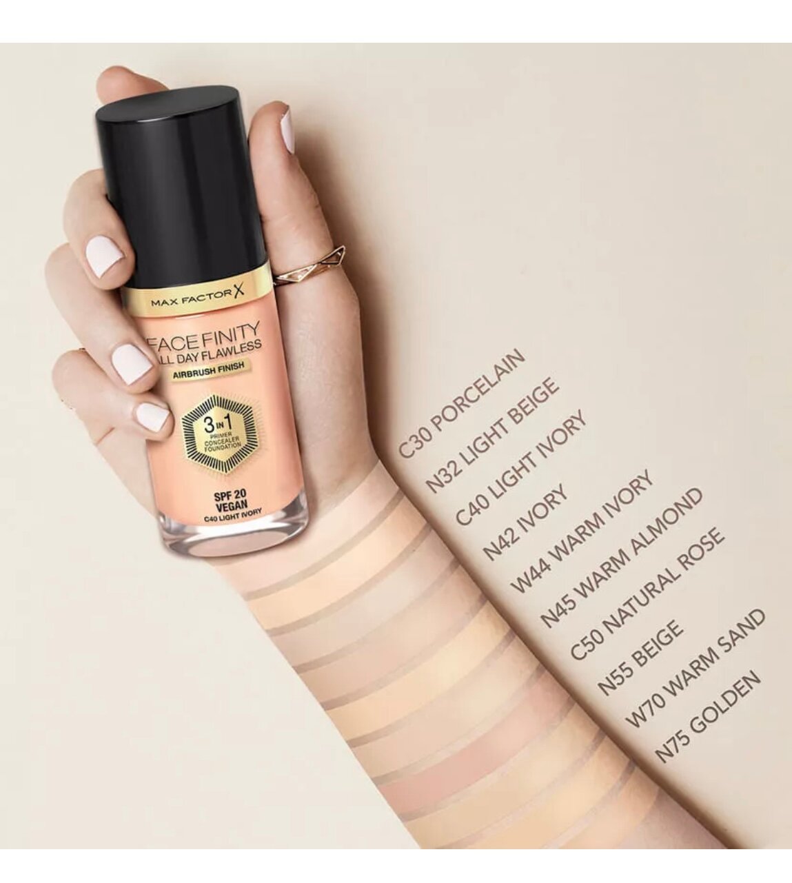 Max Factor Тональная эмульсия Facefinity All Day Flawless 3-in-1, SPF 20, 30 мл, оттенок: 40 Light Ivory
