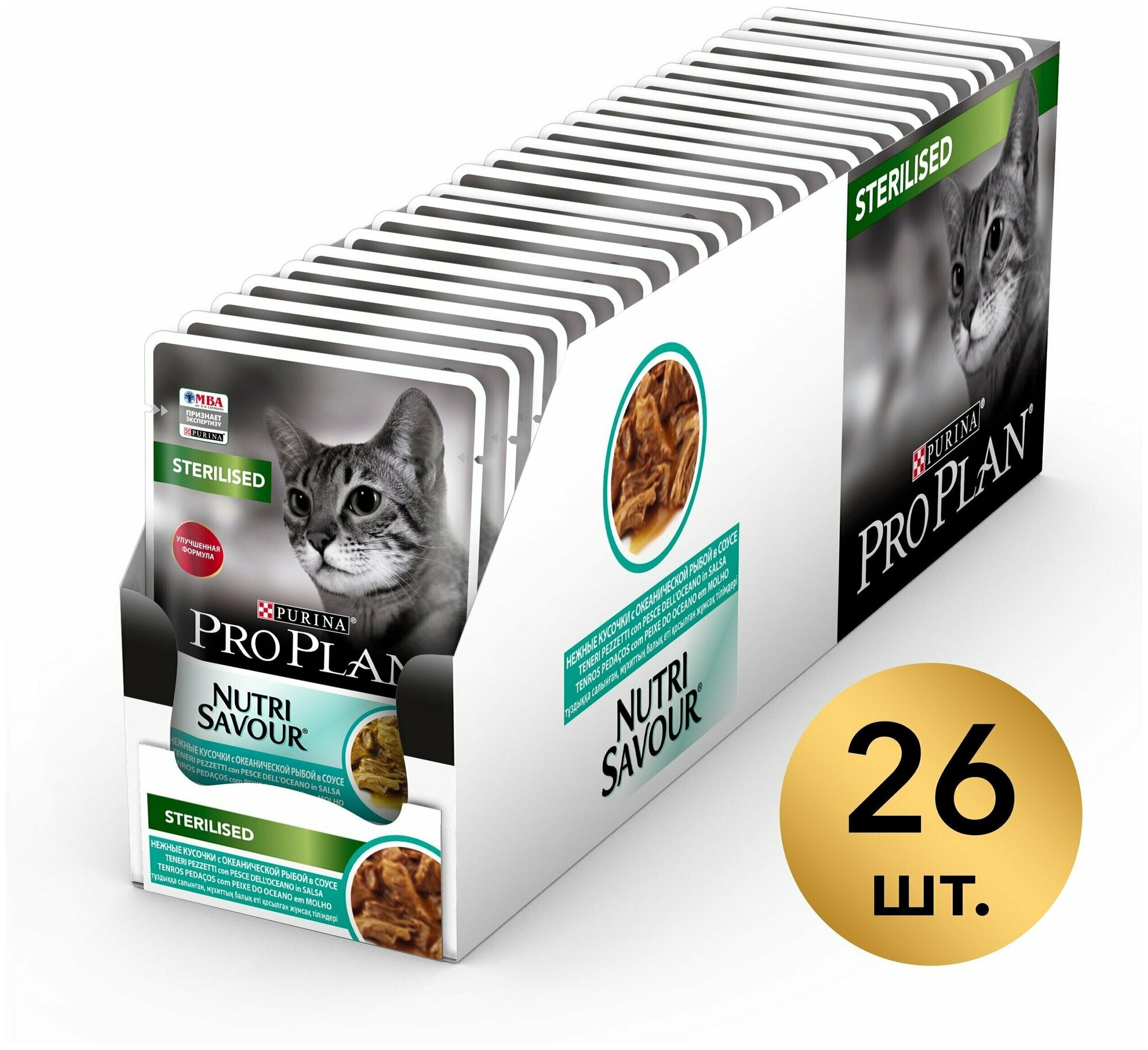 Pro Plan Nutrisavour Sterilised пауч для стерилизованных кошек и котов (кусочки в соусе) Океаническая рыба, 85 г. упаковка 26 шт
