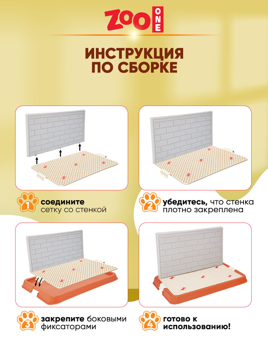 | Отзыв: | Выглядит симпатично, стенка крепится к решетке в трёх точках, у меня входят только 2, третья по размеру не подошла, собакам не приглянулся, привыкали около месяца, сейчас используют, когда второй лоток «использован», кобели стенку освоили, но им не удобно из-за наклона стенки, в общем, не факт, что песель одобрит |
