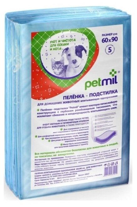 Пеленки Petmil впитывающая одноразовая 60*90*5шт / 1 шт
