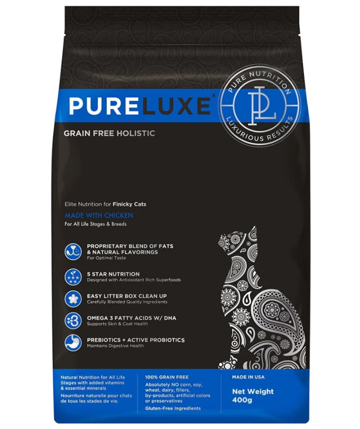 Сухой беззерновой корм PureLuxe Пурлюкс класса холистик для привередливых кошек всех пород на любых этапах жизни, со свежей курицей, 400 гр.