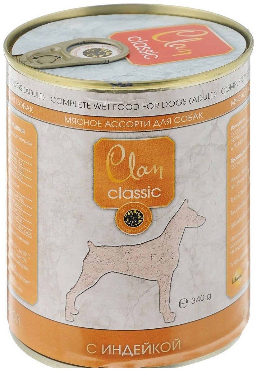Корм полнорационный консервированный Clan CLASSIC для собак, Мясное ассорти с индейкой, 340г, 12 шт.