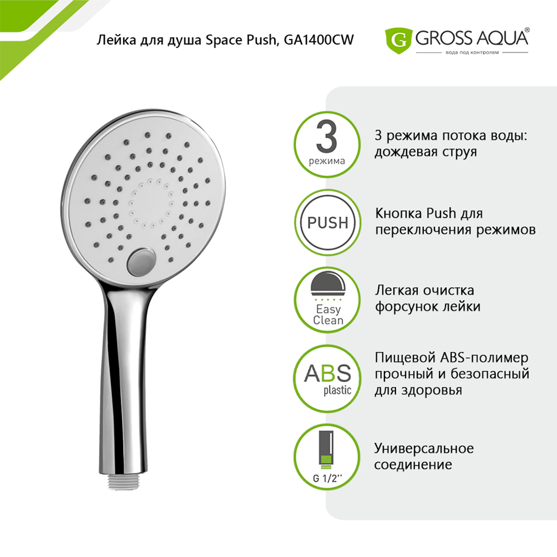 Лейка для душа 3 режима с кнопкой управления Gross Aqua Space Push, abs-пластик, хром, GA1400CW.