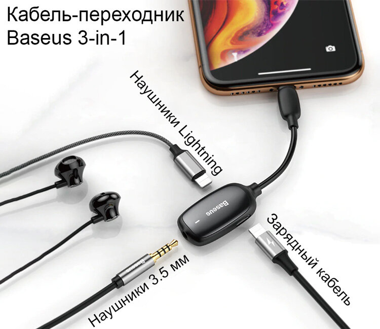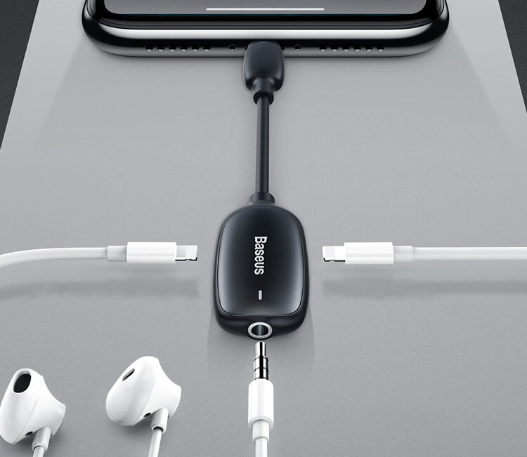 Адаптер Baseus Lightning to Dual Lightning+3,5mm black интересное: